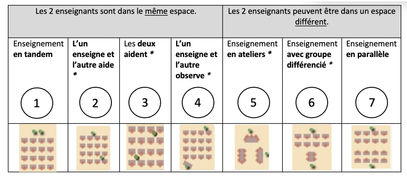 Le coenseignement peut s'organiser selon différentes modalités d'intervention. Au total, on en compte 7 différentes. A chaque modalité correspond un type de relation enseignants-élèves, une organisation interne et une distribution des rôles entre les enseignants.