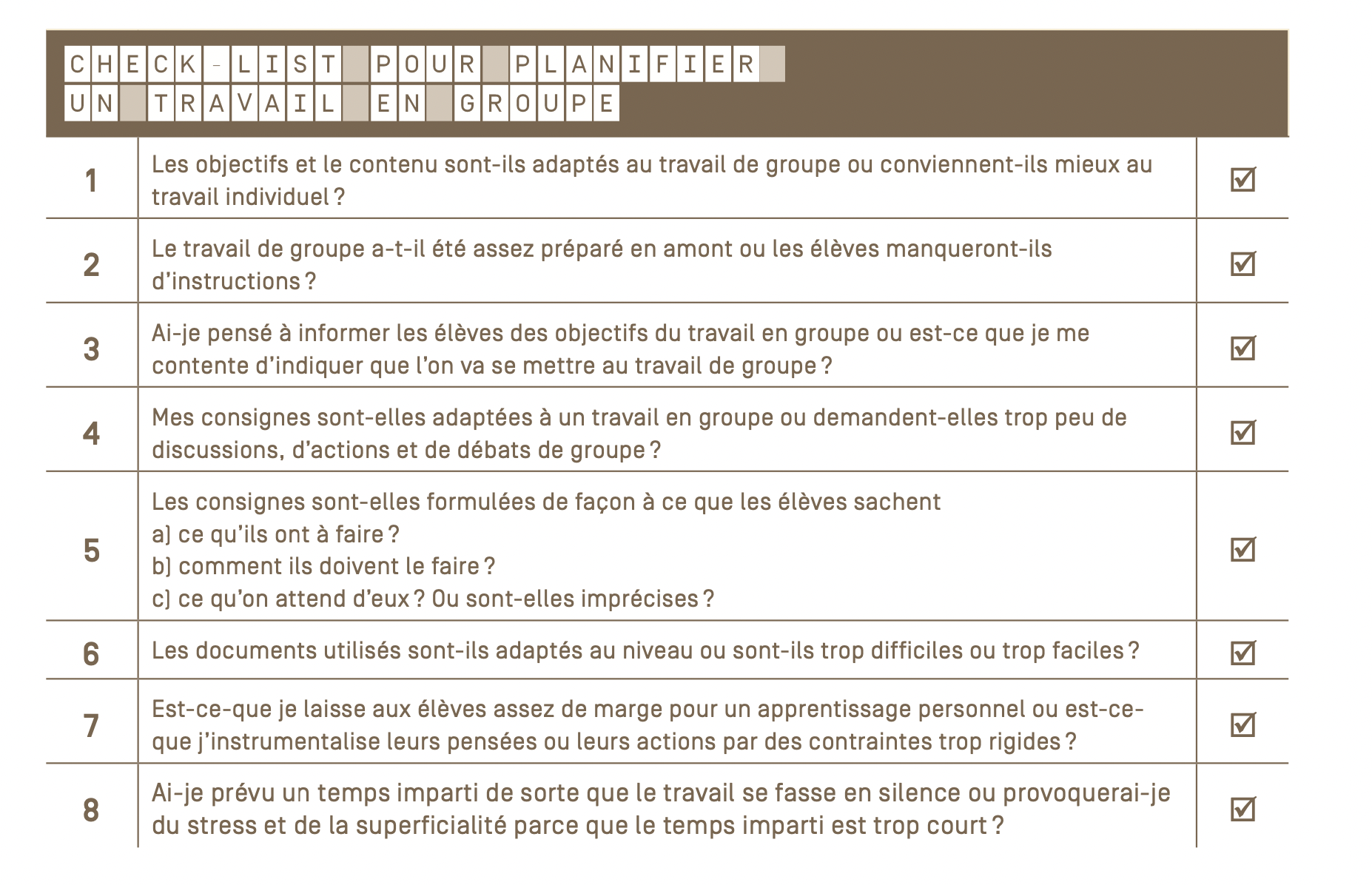 J'ai pu aussi trouver une ressources sur le site CANOPE qui donne des pistes pour réaliser le travail de groupe(s) avec les élèves. Cet article donne notamment des pistes pour la formation des groupes, étape cruciale du travail de groupe(s) et une check list pour la préparation d'un travail de groupe(s).